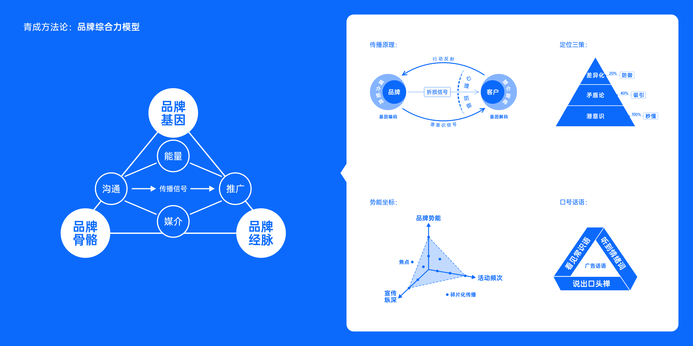 青成設(shè)計(jì)品牌咨詢公司原創(chuàng)的方法論有:品牌綜合力模型、品牌基因傳播原理、品牌骨骼體系的構(gòu)造、品牌經(jīng)脈傳播公關(guān)理論、品牌定位營銷策劃原理、品牌勢能宣傳坐標(biāo)、品牌話語體系(命名+Slogan廣告口號(hào)+撰述)等專業(yè)咨詢理論系統(tǒng)。