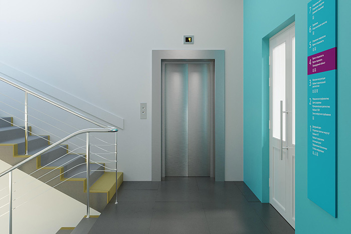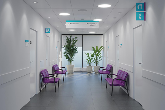 大型顯眼標(biāo)志垂直懸掛在走廊上:醫(yī)療部門是直的,醫(yī)療中心在右邊。墻支架面板提供了更多細(xì)節(jié),并顯示了通往特定對象的方式:辦公室,手術(shù)室,電梯或洗手間。尋路標(biāo)志在地板上毫不擾動地重復(fù):瓷磚上貼有帶有房間編號和箭頭范圍的淺色貼紙。