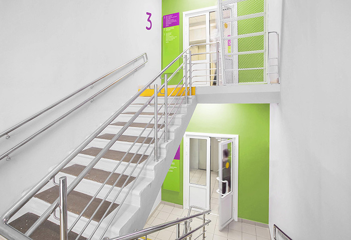 門板用顏色編碼:醫(yī)生的辦公室標(biāo)有青綠色條紋(兒童綜合診所為沙拉綠色),檢查室(超聲波,ECG)標(biāo)有芥末色,以此類推。房間編號以友好的Shlange字體輸入,為灰色或淺灰色。這樣可以使數(shù)字保持可見,而不會在走廊上引起太多關(guān)注。