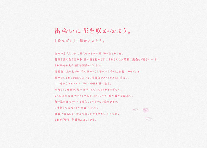 廣州vi設(shè)計(jì)公司報(bào)道:“Kinoene Haruzake Kanbashi”是由千葉縣清酒釀造廠“飯沼本店”作為當(dāng)季產(chǎn)品提供的純米大吟釀清酒(Haruzake中的“ Haru”表示“春天”,“ Zake”表示“清酒”)。廣州vi設(shè)計(jì)公司認(rèn)識(shí)到它是季節(jié)性產(chǎn)品每年生產(chǎn)。品牌設(shè)計(jì)公司制作了產(chǎn)品品牌概念和銷售角色,更新了瓶子的外包裝VI設(shè)計(jì),制作了用于分銷渠道的印刷媒體等設(shè)計(jì)品。Kinoene Haruzake Kanbashi的一個(gè)新概念是“為獨(dú)特的相遇而造”。春天被認(rèn)為是在日本新相遇的時(shí)候。釀酒者希望的是不熟悉日本清酒的人們將這種清酒作為“第一瓶”品嘗,并用清酒慶祝他們的新相遇。該概念是基于此想法而創(chuàng)建的。打開瓶蓋后,立即會(huì)出現(xiàn)濃郁的香氣。廣州vi設(shè)計(jì)公司認(rèn)為深沉的身體以及略帶泡沫散發(fā)出淡淡的波光粼粼的新鮮味道。香氣之間的微妙平衡將成為日本清酒良好印象的積極起點(diǎn)。就像友誼逐漸增長的方式一樣,“ Kinoene Haruzake Kanbashi”的風(fēng)味也在變化。打開瓶蓋后,年輕而新鮮的味道將變成柔和的風(fēng)味,具有濃郁的醇厚和甜味。當(dāng)您沉浸在春天時(shí),清酒品質(zhì)的轉(zhuǎn)變將與季節(jié)的變化,時(shí)間的流逝或與飲用清酒的好友的加深聯(lián)系相重疊。這為人們?nèi)绾蜗硎苋毡厩寰铺峁┝艘粋€(gè)新的方式。櫻花花瓣用于瓶身包裝設(shè)計(jì)。沒有盛開的花朵,只有落下的花瓣,使人們思考季節(jié)的變化和時(shí)間的流逝。淺粉紅色在促銷工具以及瓶子上均勻使用,代表著春天的快感。