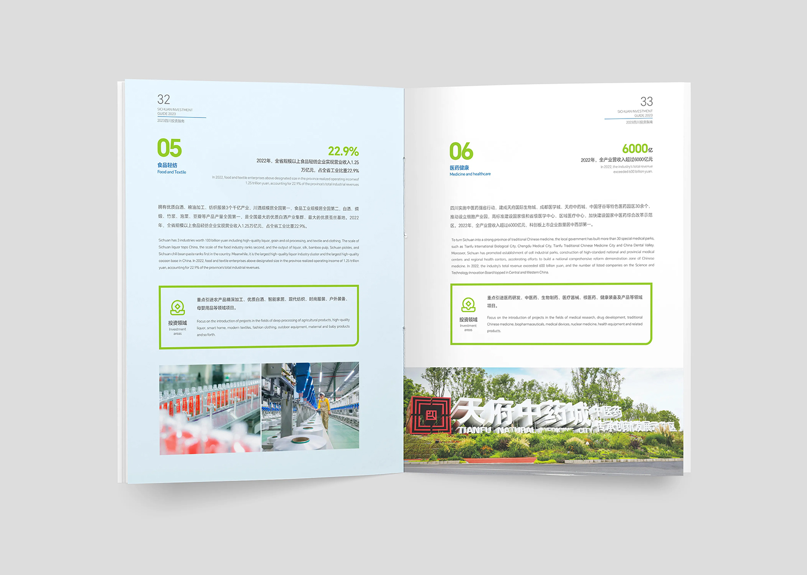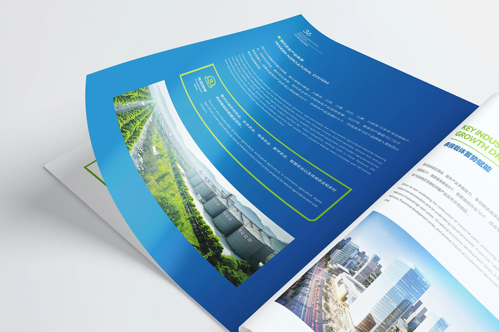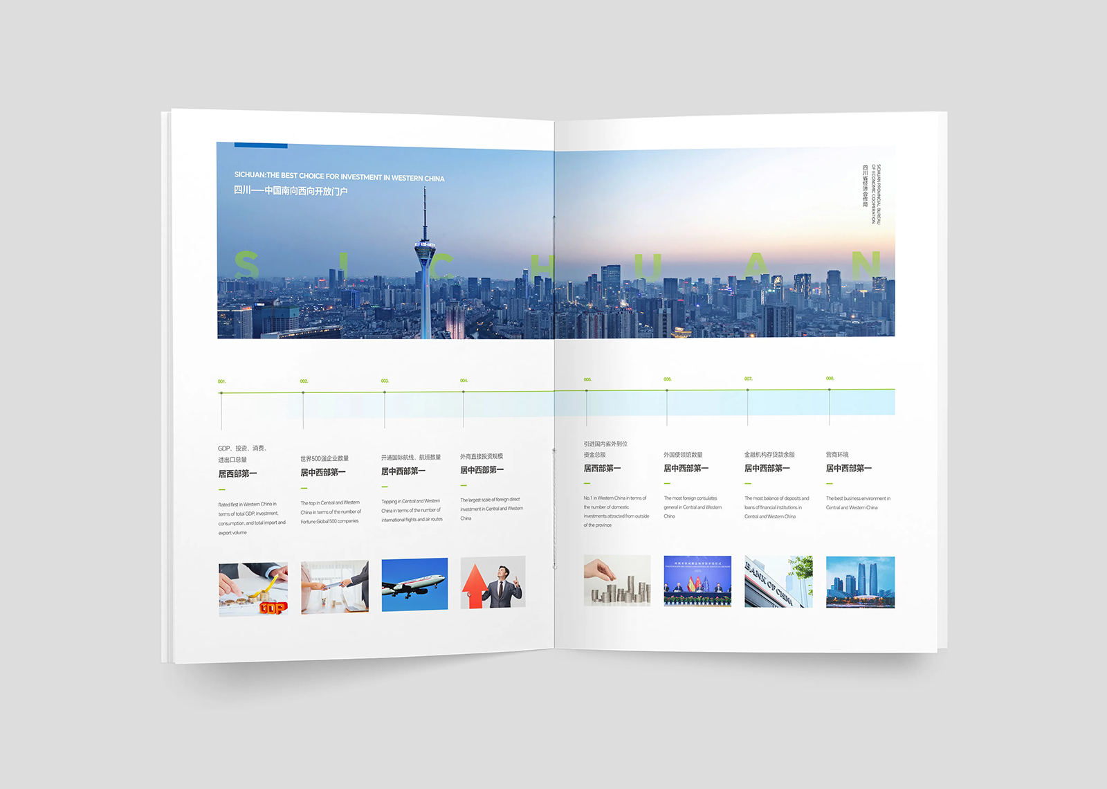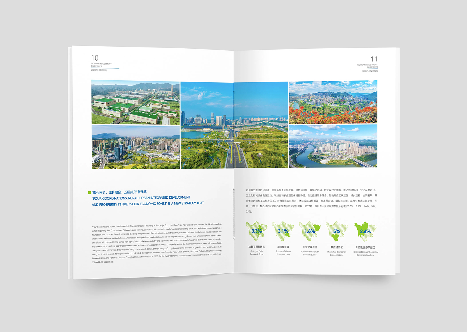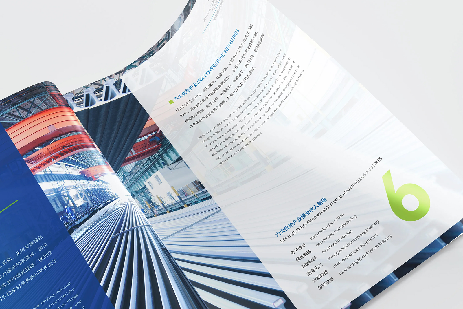 視覺風(fēng)格是招商手冊(cè)至關(guān)重要的部分,它不僅能夠吸引觀眾的注意力,還能傳達(dá)信息的核心價(jià)值和品牌形象。設(shè)計(jì)招商手冊(cè)時(shí),我們的目標(biāo)是全面展示區(qū)域在經(jīng)濟(jì)、資源和投資環(huán)境方面的獨(dú)特優(yōu)勢(shì)。畫冊(cè)通過一系列精心挑選的圖片和數(shù)據(jù),傳達(dá)了作為中國(guó)西部地區(qū)投資首選地的強(qiáng)大吸引力。首先畫冊(cè)的開篇通過一系列圖表和數(shù)據(jù),突出了地區(qū)在多個(gè)經(jīng)濟(jì)指標(biāo)上的領(lǐng)先地位。例如地區(qū)在進(jìn)出口、外商直接投資規(guī)模、國(guó)際航線和航班數(shù)量等方面均居中西部第一,展現(xiàn)了其作為中國(guó)南向西向開放門戶的重要地位。畫冊(cè)深入介紹了地區(qū)的發(fā)展戰(zhàn)略,這一戰(zhàn)略強(qiáng)調(diào)了新型工業(yè)化、信息化、城鎮(zhèn)化和農(nóng)業(yè)現(xiàn)代化的深度融合,以及城鄉(xiāng)一體化發(fā)展,旨在推動(dòng)地區(qū)經(jīng)濟(jì)的全面繁榮。在資源稟賦方面,畫冊(cè)突出了地區(qū)在清潔能源、礦產(chǎn)資源和文旅資源方面的獨(dú)特優(yōu)勢(shì)。同時(shí)礦產(chǎn)資源豐富擁有多種金屬和非金屬礦產(chǎn),為工業(yè)發(fā)展提供了堅(jiān)實(shí)的基礎(chǔ)。畫冊(cè)還詳細(xì)介紹了每個(gè)區(qū)域都有其獨(dú)特的產(chǎn)業(yè)集群和發(fā)展方向。在投資領(lǐng)域畫冊(cè)強(qiáng)調(diào)了地區(qū)在先進(jìn)材料、能源化工、食品輕紡和醫(yī)藥健康等行業(yè)的發(fā)展?jié)摿?。通過展示各行業(yè)的主營(yíng)業(yè)務(wù)收入增長(zhǎng)數(shù)據(jù),向潛在投資者展示了地區(qū)強(qiáng)勁發(fā)展?jié)摿?。整本畫?cè)通過豐富的數(shù)據(jù)、清晰的圖表和直觀的圖片,全面展示了在經(jīng)濟(jì)、資源和投資環(huán)境方面的優(yōu)勢(shì)使其成為有力宣傳資料。