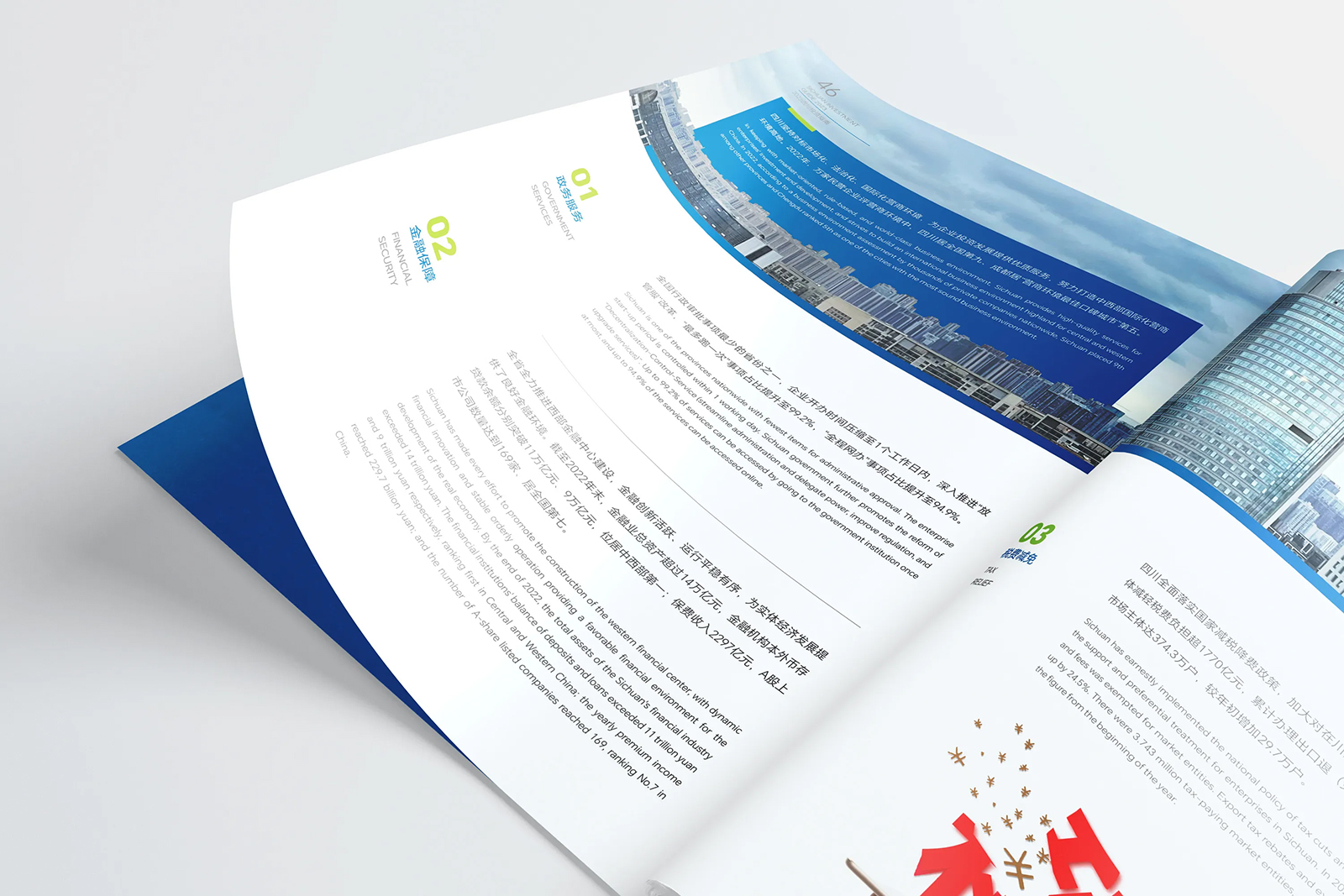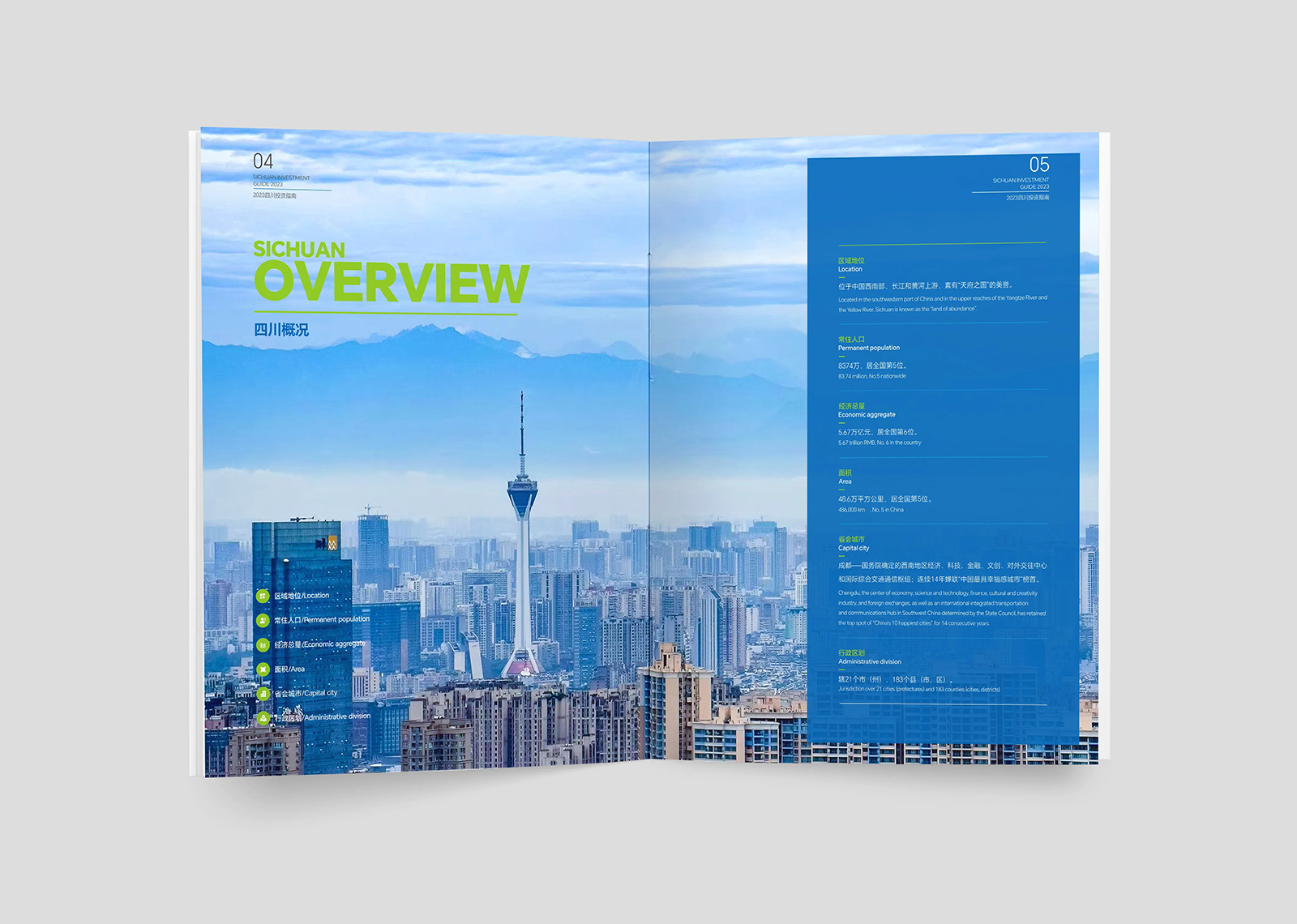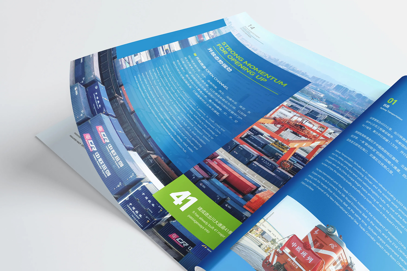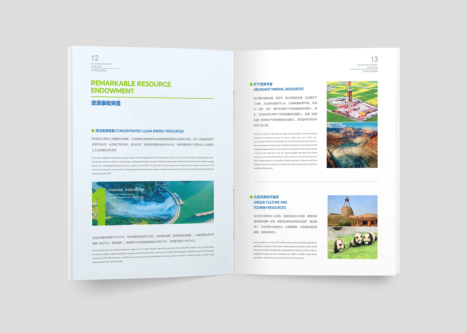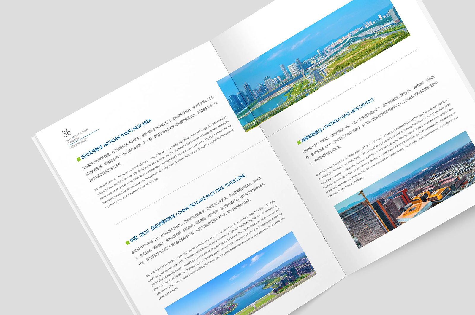 視覺風(fēng)格是招商手冊(cè)至關(guān)重要的部分,它不僅能夠吸引觀眾的注意力,還能傳達(dá)信息的核心價(jià)值和品牌形象。設(shè)計(jì)招商手冊(cè)時(shí),我們的目標(biāo)是全面展示區(qū)域在經(jīng)濟(jì)、資源和投資環(huán)境方面的獨(dú)特優(yōu)勢(shì)。畫冊(cè)通過一系列精心挑選的圖片和數(shù)據(jù),傳達(dá)了作為中國(guó)西部地區(qū)投資首選地的強(qiáng)大吸引力。首先畫冊(cè)的開篇通過一系列圖表和數(shù)據(jù),突出了地區(qū)在多個(gè)經(jīng)濟(jì)指標(biāo)上的領(lǐng)先地位。例如地區(qū)在進(jìn)出口、外商直接投資規(guī)模、國(guó)際航線和航班數(shù)量等方面均居中西部第一,展現(xiàn)了其作為中國(guó)南向西向開放門戶的重要地位。畫冊(cè)深入介紹了地區(qū)的發(fā)展戰(zhàn)略,這一戰(zhàn)略強(qiáng)調(diào)了新型工業(yè)化、信息化、城鎮(zhèn)化和農(nóng)業(yè)現(xiàn)代化的深度融合,以及城鄉(xiāng)一體化發(fā)展,旨在推動(dòng)地區(qū)經(jīng)濟(jì)的全面繁榮。在資源稟賦方面,畫冊(cè)突出了地區(qū)在清潔能源、礦產(chǎn)資源和文旅資源方面的獨(dú)特優(yōu)勢(shì)。同時(shí)礦產(chǎn)資源豐富擁有多種金屬和非金屬礦產(chǎn),為工業(yè)發(fā)展提供了堅(jiān)實(shí)的基礎(chǔ)。畫冊(cè)還詳細(xì)介紹了每個(gè)區(qū)域都有其獨(dú)特的產(chǎn)業(yè)集群和發(fā)展方向。在投資領(lǐng)域畫冊(cè)強(qiáng)調(diào)了地區(qū)在先進(jìn)材料、能源化工、食品輕紡和醫(yī)藥健康等行業(yè)的發(fā)展?jié)摿?。通過展示各行業(yè)的主營(yíng)業(yè)務(wù)收入增長(zhǎng)數(shù)據(jù),向潛在投資者展示了地區(qū)強(qiáng)勁發(fā)展?jié)摿?。整本畫?cè)通過豐富的數(shù)據(jù)、清晰的圖表和直觀的圖片,全面展示了在經(jīng)濟(jì)、資源和投資環(huán)境方面的優(yōu)勢(shì)使其成為有力宣傳資料。