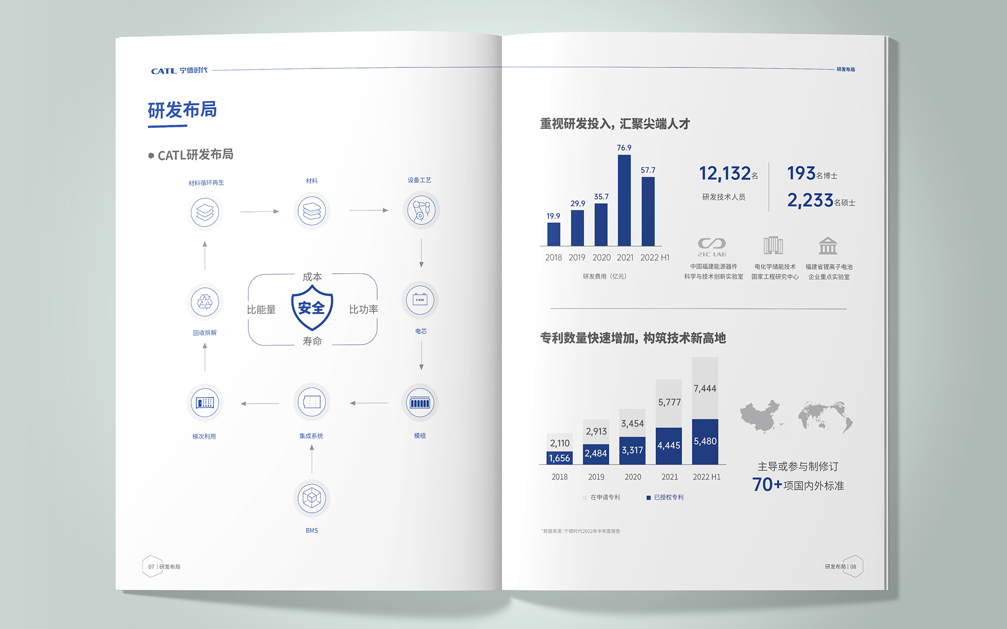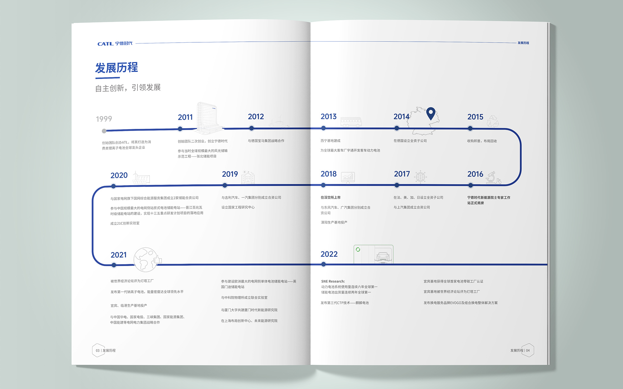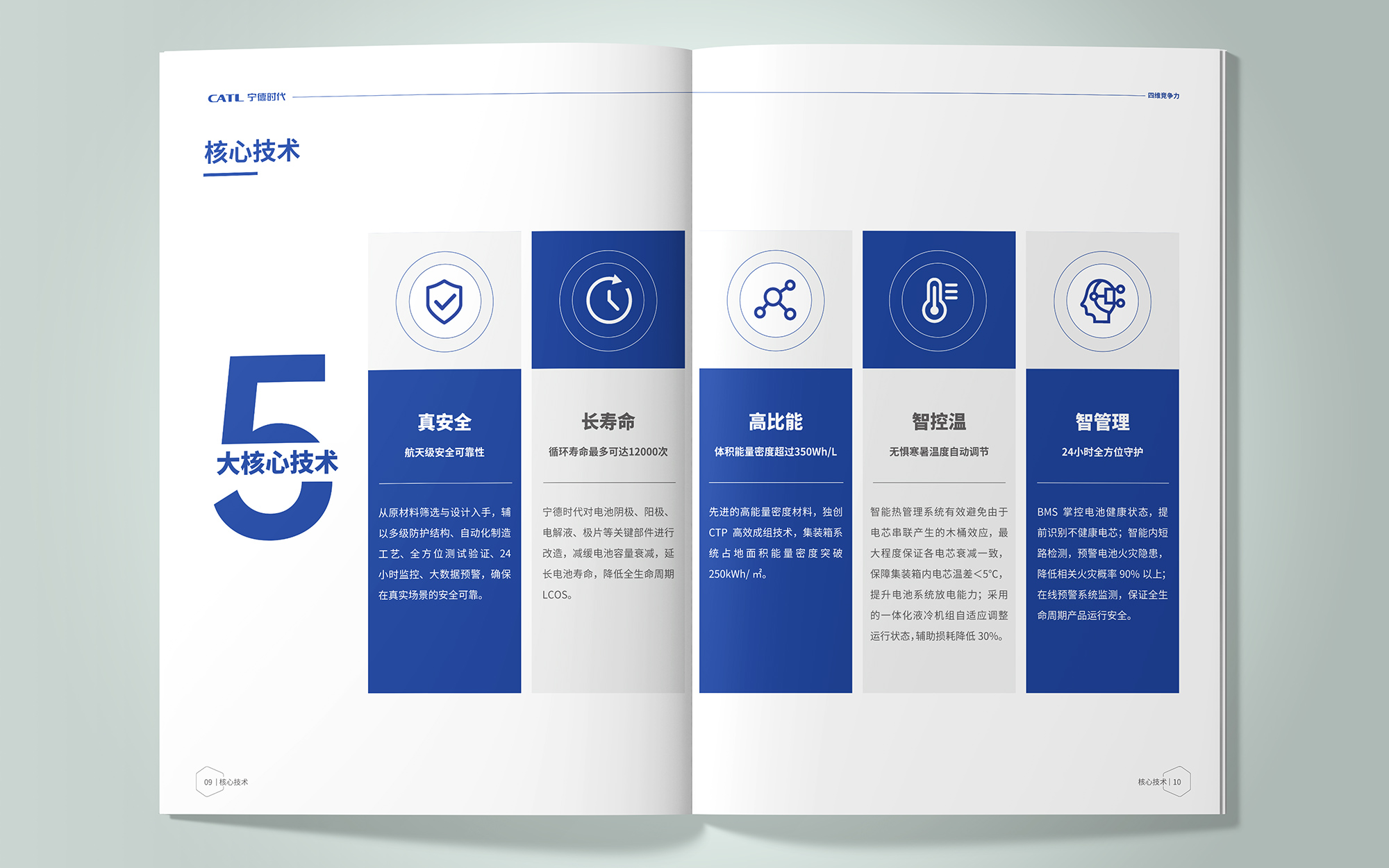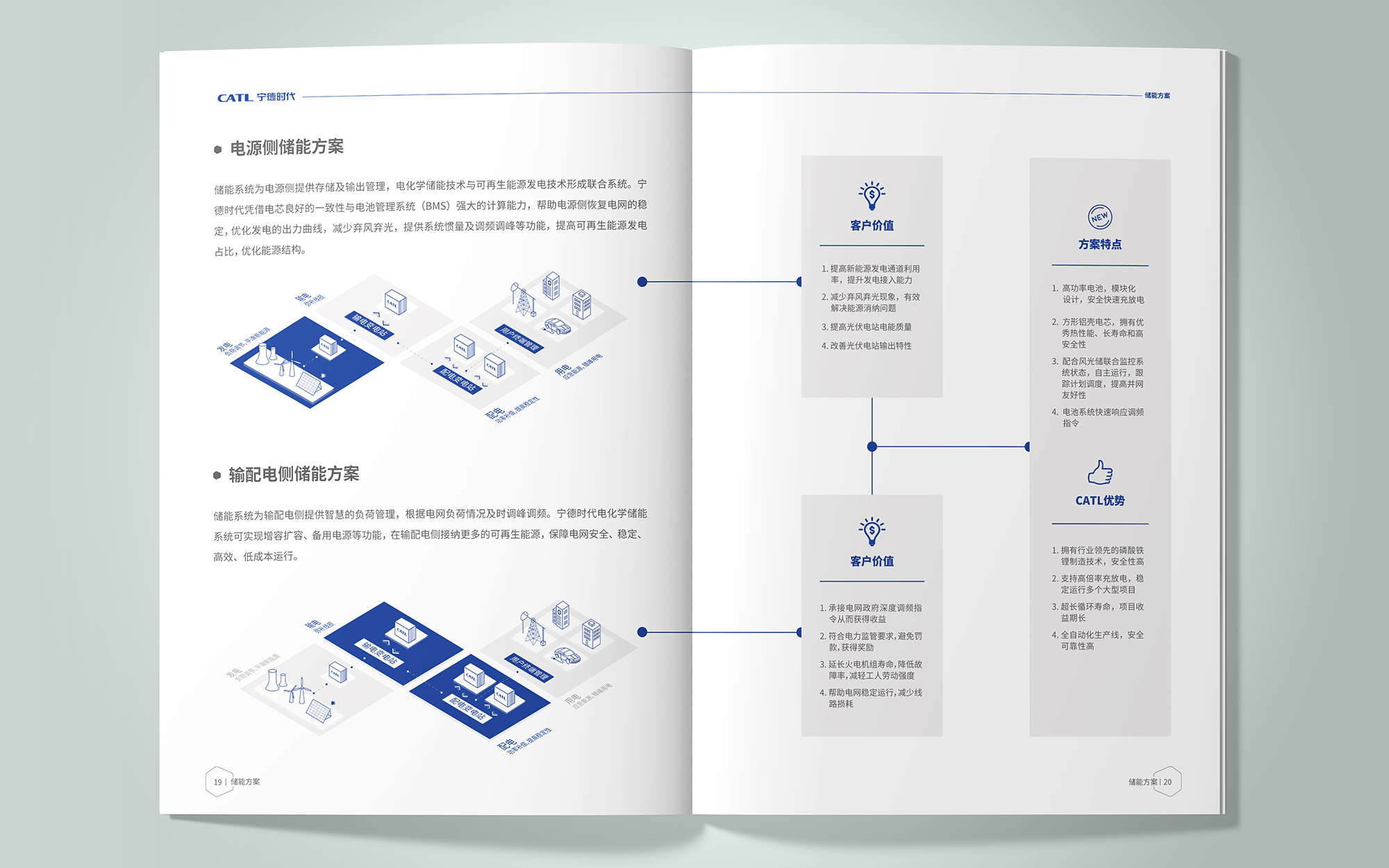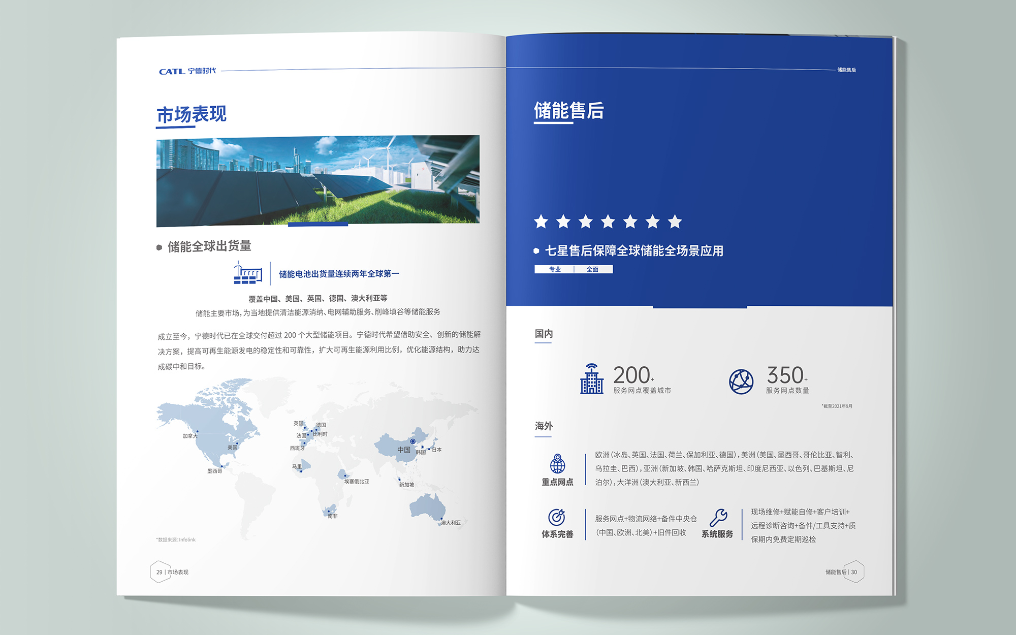 企業(yè)宣傳畫冊設(shè)計是以零碳未來能無界為核心主題,采用簡潔科技藍+純凈白的視覺基調(diào),輔以漸變能量光帶貫穿始終,象征新能源的無限流動與全球化連接。封面以立體浮雕工藝呈現(xiàn)品牌標(biāo)識,下方“儲能全系統(tǒng)解決方案及產(chǎn)品手冊”字樣選用金屬銀燙印,在光線折射下隱現(xiàn)未來質(zhì)感。整冊采用200g高階雪銅紙,觸感細膩,環(huán)保大豆油墨印刷,呼應(yīng)綠色可持續(xù)理念。版式上,信息被精準(zhǔn)劃分為“關(guān)于、歷程、全球”三大章節(jié),每一章以全幅場景大圖開場,隨后以模塊化網(wǎng)格梳理數(shù)據(jù):左頁放宏觀敘事,右頁用信息圖表+實物特寫,實現(xiàn)理性與感性平衡;關(guān)鍵數(shù)字如“研發(fā)投入5.10%”“動力電池系統(tǒng)使用量連續(xù)六年全球第一”均以動態(tài)熒光綠突出,形成視覺錨點。發(fā)展歷程頁采用時間軸折頁設(shè)計,時間關(guān)鍵節(jié)點以銀色金屬線串聯(lián)形成長卷,增強互動儀式感。全球布局章節(jié)則以世界地圖為底,生產(chǎn)基地與研發(fā)中心用3D立體ICON懸浮其上,輔以AR掃碼即可觀看基地實時影像,實現(xiàn)紙質(zhì)與數(shù)字融合。封面與封底均內(nèi)有二維碼手機輕觸即可跳轉(zhuǎn)企業(yè)官網(wǎng),延伸閱讀。整套畫冊在嚴(yán)謹(jǐn)中釋放高端科技感,在秩序中暗含澎湃能量,精準(zhǔn)傳遞了企業(yè)世界級的品牌愿景。