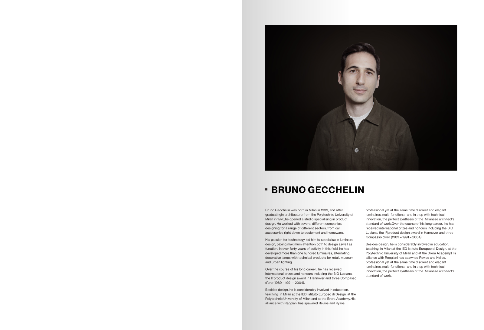 布魯諾1969年出生于意大利米蘭,1994年畢業(yè)于米蘭理工大學(xué)建筑設(shè)計(jì)專業(yè),之后開設(shè)了專門從事燈光產(chǎn)品設(shè)計(jì)工作室。他曾與幾家不同的燈光照明公司合作,為不同的領(lǐng)域進(jìn)行了一系列的燈光設(shè)計(jì),從汽車配件設(shè)備到家居用品。他對(duì)技術(shù)的熱情使他專注于燈具照明設(shè)計(jì),對(duì)燈光設(shè)計(jì)和功能都給予了極大的關(guān)注。在燈光照明領(lǐng)域三十多年的職業(yè)生涯中,他開發(fā)了100多款燈具,將裝飾燈與零售店面、博物館和城市照明的技術(shù)產(chǎn)品交替使用。在他漫長(zhǎng)的職業(yè)生涯中,獲得了國(guó)際獎(jiǎng)項(xiàng)和榮譽(yù)包括BIOLubiana、漢諾威IFproduct設(shè)計(jì)獎(jiǎng)和三個(gè)Compassod'oro(1999-2005-2014)。除了設(shè)計(jì)之外他還大量參與了教育在米蘭的IED歐洲設(shè)計(jì)學(xué)院、米蘭理工大學(xué)和布雷拉學(xué)院任教。他與雷賈尼的聯(lián)盟催生了Revios和Kylios,他們的設(shè)計(jì)專業(yè)嚴(yán)謹(jǐn)同時(shí)兼具優(yōu)雅美學(xué)的燈具、多功能和技術(shù)創(chuàng)新完美融合了米蘭建筑師的工作標(biāo)準(zhǔn)。