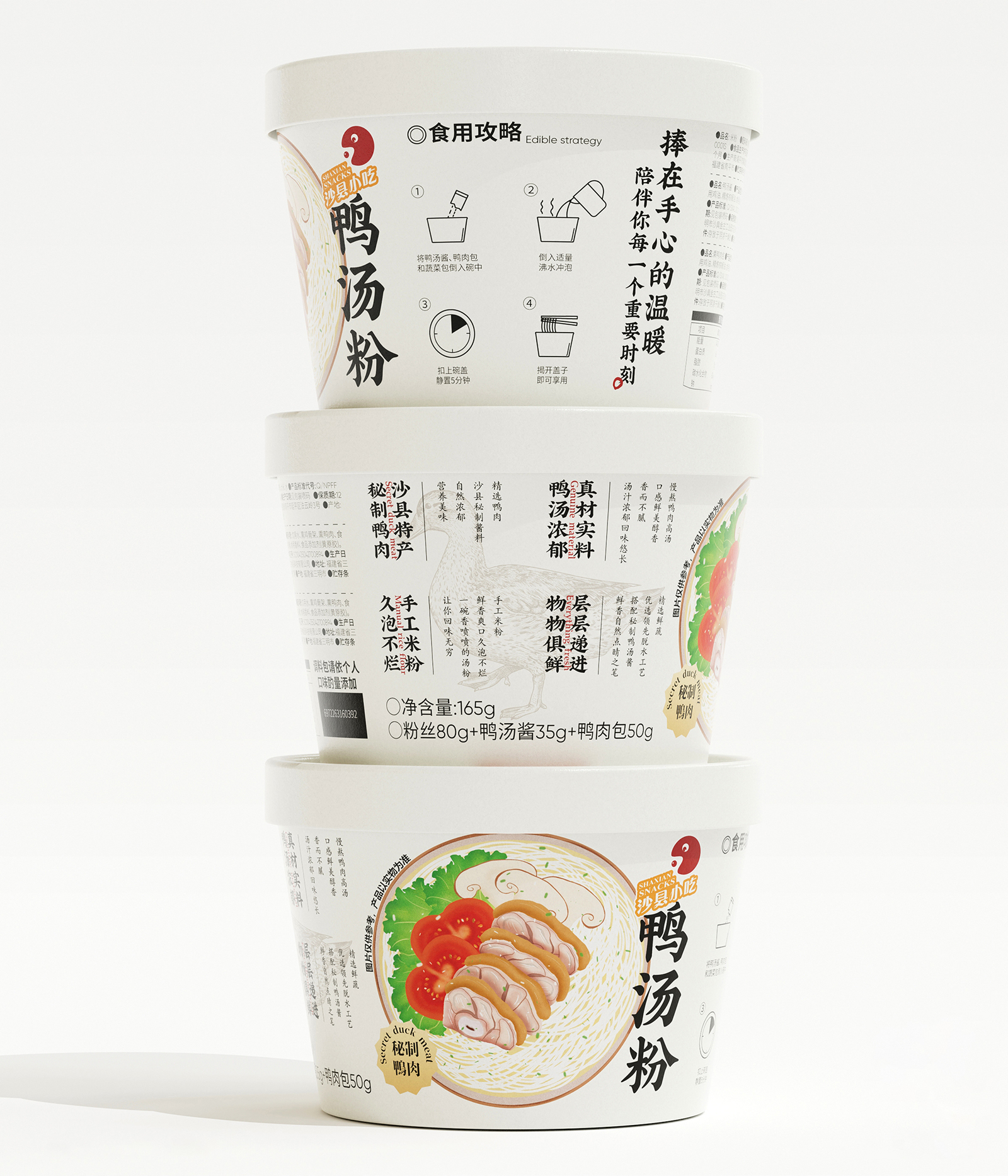 秘制鴨肉鴨湯粉是一款以秘制鴨肉為主要原料的即食產(chǎn)品,其獨(dú)特的風(fēng)味和便捷的食用方式使其成為現(xiàn)代消費(fèi)者追求美味與便利的理想選擇。從產(chǎn)品名稱來看,“秘制鴨肉”和“鴨湯粉”這兩個(gè)詞就充分體現(xiàn)了產(chǎn)品的特色。秘制意味著經(jīng)過特殊的烹飪工藝處理,使得鴨肉的味道更加獨(dú)特和鮮美;而“鴨湯粉”則直接表明這是一種以鴨湯為基底的面條產(chǎn)品,不僅保留了鴨肉的鮮美,還融合了鴨湯的營養(yǎng)成分。其次鴨湯粉的包裝簡潔大方,以白色為主色調(diào),突出了產(chǎn)品的自然和純凈感。包裝上的圖案清晰地展示了鴨肉和面條的形象,讓人一眼就能了解產(chǎn)品的主要成分和特點(diǎn)。同時(shí),包裝上的文字信息詳細(xì)介紹了產(chǎn)品的名稱、品牌以及凈含量等關(guān)鍵信息,方便消費(fèi)者快速識別和選擇。