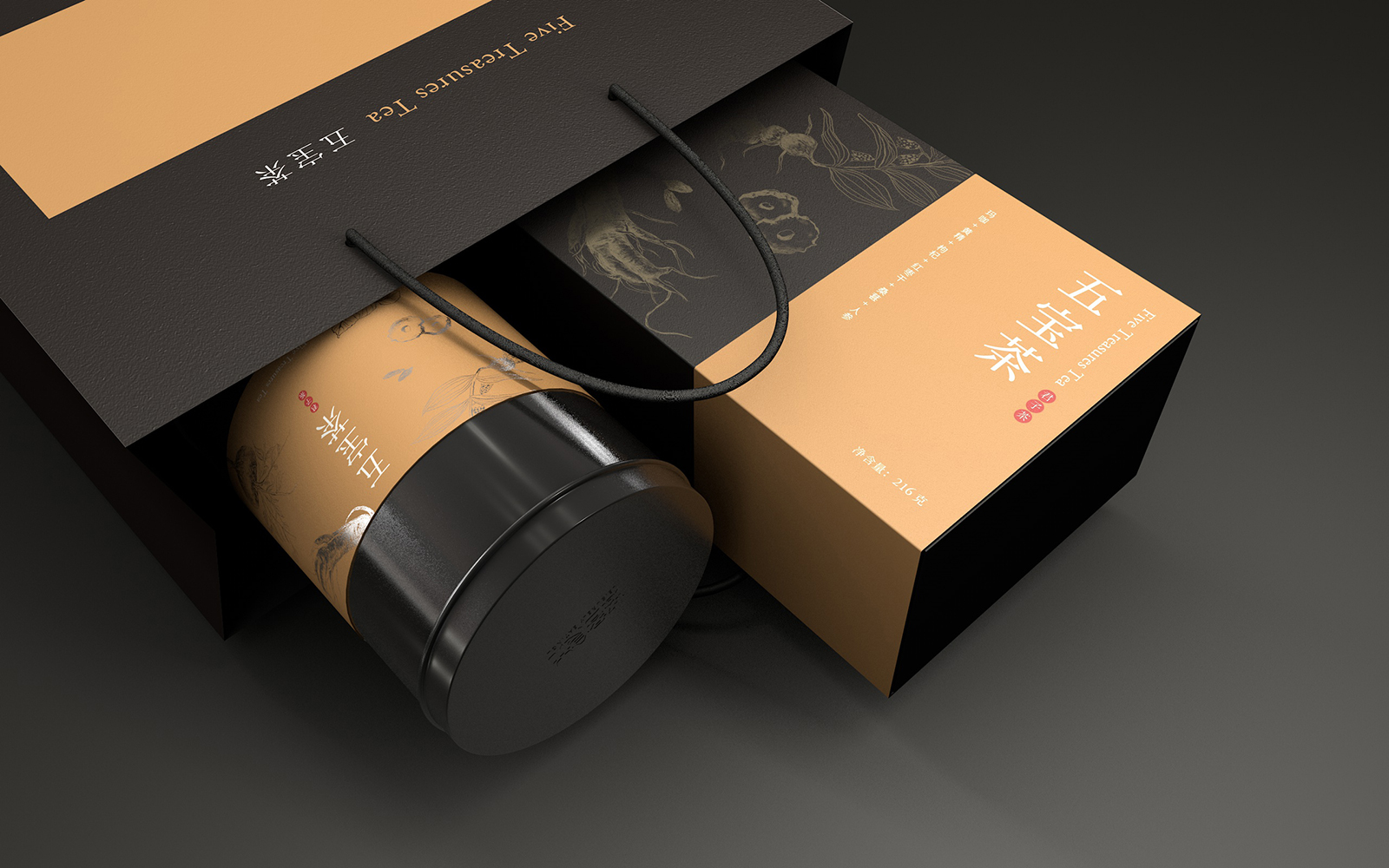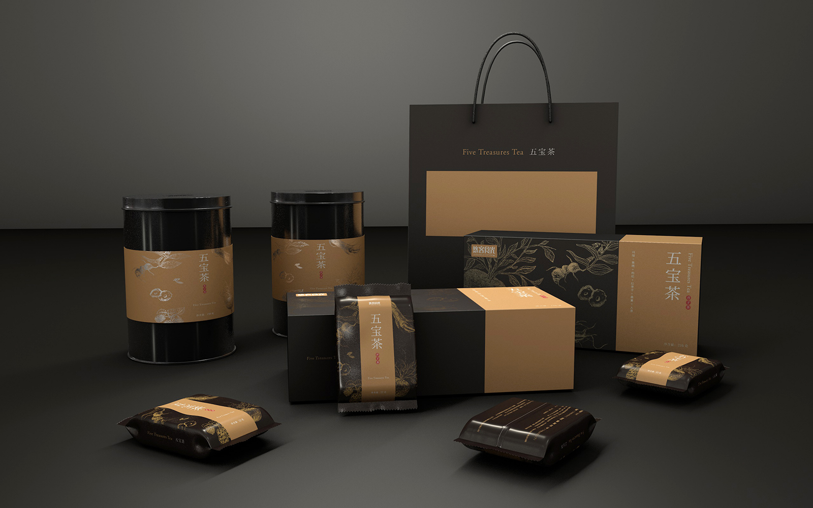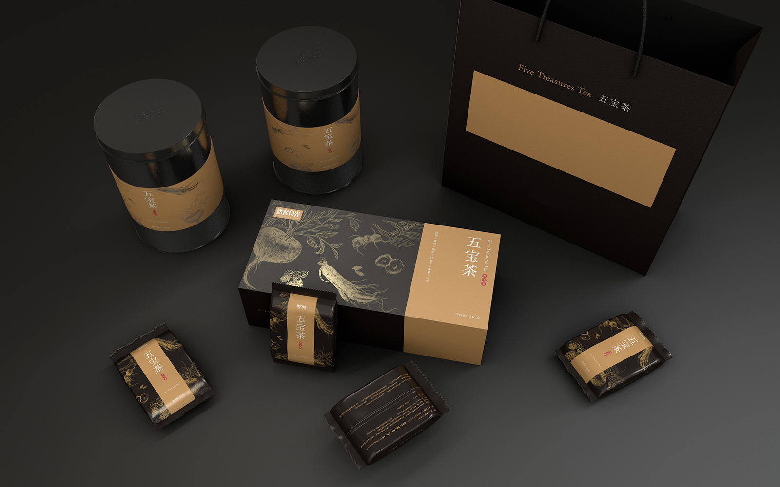 在包裝結(jié)構(gòu)與功能設(shè)計(jì)上,五寶茶的包裝設(shè)計(jì)不僅注重美觀性,還兼顧了功能性和環(huán)保性。整個(gè)包裝系列包括了茶葉罐、禮盒、單獨(dú)的小包裝袋,以及一個(gè)便于攜帶的手提袋。茶葉罐采用了圓柱形設(shè)計(jì),表面為啞光黑色金屬材質(zhì)。罐身中央以一條寬幅的標(biāo)簽環(huán)繞,標(biāo)簽上的金色草本植物圖案與罐身的黑色形成強(qiáng)烈的視覺(jué)對(duì)比,同時(shí)標(biāo)簽上的產(chǎn)品名稱“五寶茶”以簡(jiǎn)潔有力的白色字體印刷,搭配紅色的小印章,凸顯出產(chǎn)品的品質(zhì)感。茶葉罐的設(shè)計(jì)不僅確保了內(nèi)部茶葉的密封性,有效防潮防氧化,還具有極強(qiáng)的耐用性,可重復(fù)使用,符合現(xiàn)代環(huán)保理念。單獨(dú)的小包裝袋采用了與禮盒相同的配色與圖案設(shè)計(jì),便于消費(fèi)者攜帶和沖泡。每個(gè)小包裝袋都是獨(dú)立密封的,確保了茶葉的新鮮度和衛(wèi)生性。五寶茶作為一款保健茶飲,定位于中高端市場(chǎng),主要面向注重健康養(yǎng)生的消費(fèi)者群體。其包裝設(shè)計(jì)通過(guò)沉穩(wěn)大氣的配色、精致的工藝以及傳統(tǒng)文化元素的融合塑造了品牌的高端形象。