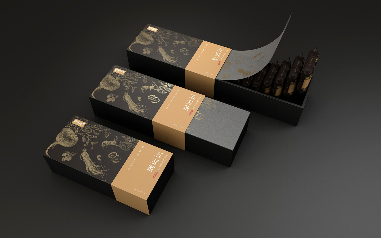 五寶茶作為一款保健產(chǎn)品,旨在傳遞健康、品質(zhì)與傳統(tǒng)的理念,其包裝設(shè)計(jì)的關(guān)鍵在于如何在視覺(jué)上與消費(fèi)者建立情感共鳴,同時(shí)突出產(chǎn)品的核心價(jià)值。五寶茶的配方源自傳統(tǒng)中醫(yī)藥的精華,融合了多種珍貴的草本植物。這些草本植物的功效不僅在于調(diào)理身體、提高免疫力,更在于長(zhǎng)期飲用對(duì)身心的滋養(yǎng)。創(chuàng)意靈感來(lái)源于古代草本植物的手繪圖案,以及中醫(yī)藥的傳統(tǒng)文化。在設(shè)計(jì)中,我們選擇了黑色作為主色調(diào),輔以金色線條勾勒的草本植物圖案,象征著產(chǎn)品的高貴與典雅。黑色代表著沉穩(wěn)與深邃,暗示著產(chǎn)品的深厚內(nèi)涵與持久效果;金色則代表著光明與希望,傳遞出五寶茶帶來(lái)的健康與活力。