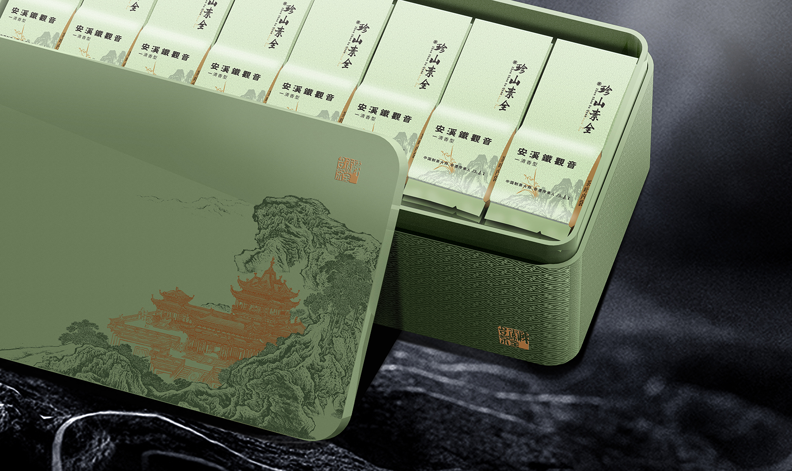 在包裝核心圖案設(shè)計上融入了抽象的山水畫元素,這些元素雖然簡約,卻蘊含著深厚的中國文化底蘊。山水畫的運用,不僅增加了包裝的藝術(shù)性,也與安溪鐵觀音的地域特色形成了和諧的共鳴,為消費者帶來了一種視覺上的享受和文化上的認同。在材質(zhì)選用上采用了高端大氣的輕質(zhì)天地鋼盒作包裝原料,增強了品質(zhì)感和實用性。安溪鐵觀音茶葉的包裝設(shè)計無論是在色彩運用、文字排版,還是在圖案設(shè)計和文化元素的融入上,都展現(xiàn)了深思熟慮和對傳統(tǒng)文化的尊重。更傳遞出品牌的東方茶文化的韻味與雅致。