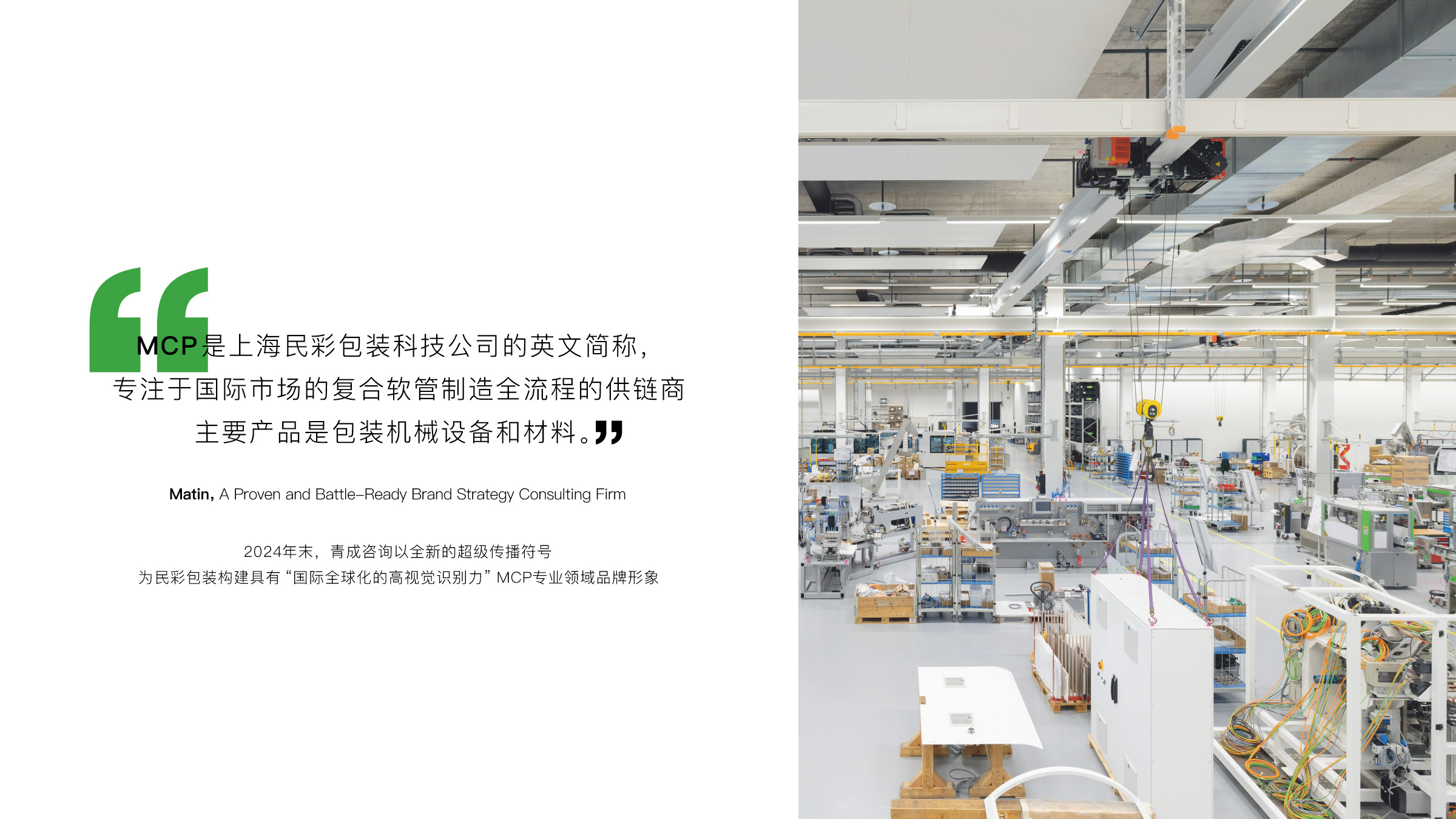 青成咨詢以全新的超級(jí)傳播符號(hào),在2025年初為民彩包裝,構(gòu)建具有“國(guó)際全球化的高視覺識(shí)別力”MCP專業(yè)領(lǐng)域品牌形象。我們從品牌策略、VI系統(tǒng)的基礎(chǔ)與應(yīng)用、企業(yè)網(wǎng)站的設(shè)計(jì)落地為客戶公司塑造了完整的企業(yè)新形象,MCP是上海民彩包裝科技有限公司的英文簡(jiǎn)稱,專注于國(guó)際市場(chǎng)的復(fù)合軟管制造全流程的供鏈商,主要產(chǎn)品是包裝機(jī)械設(shè)備和材料。