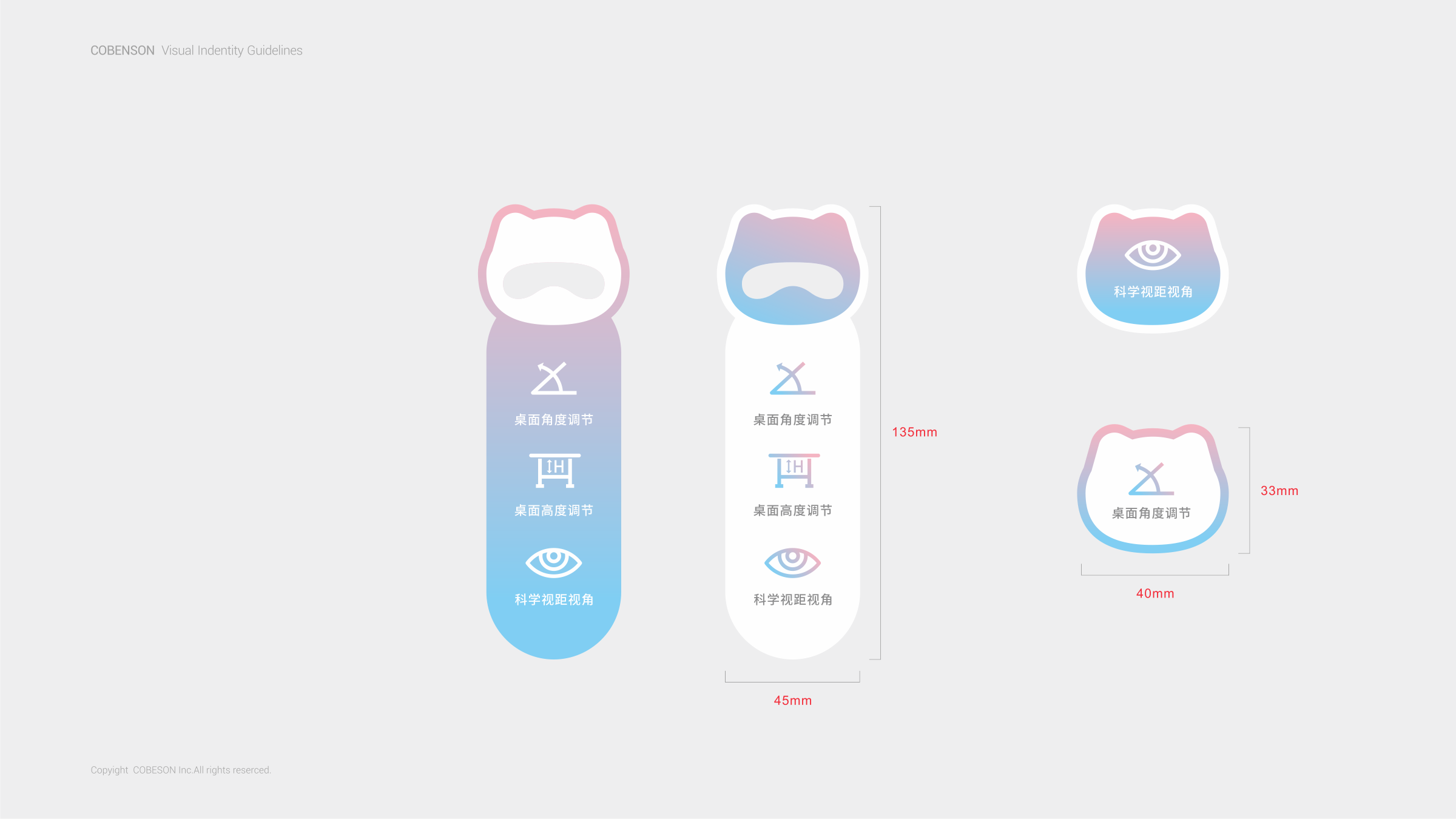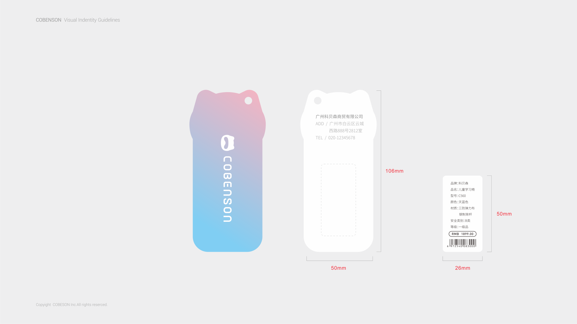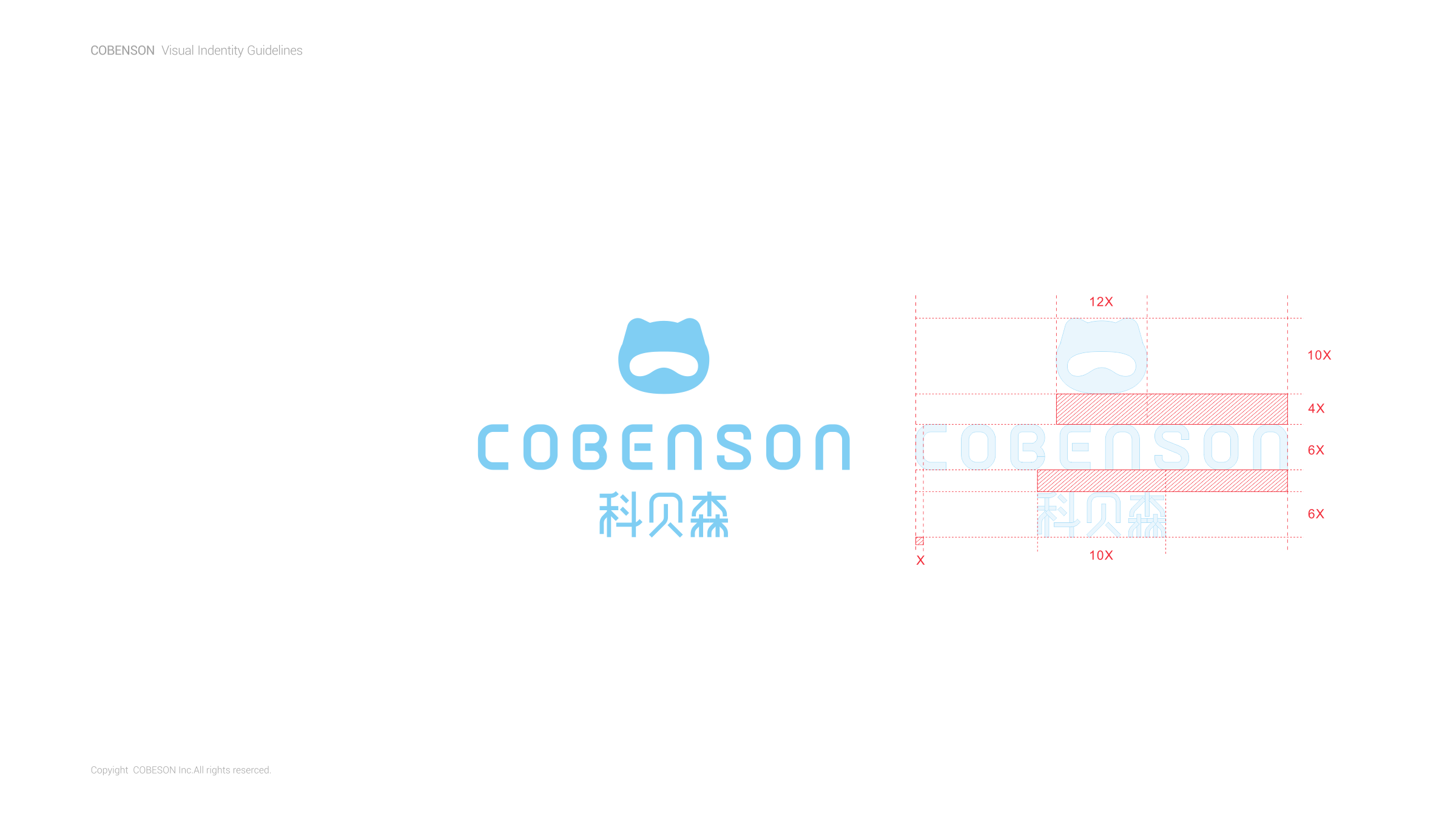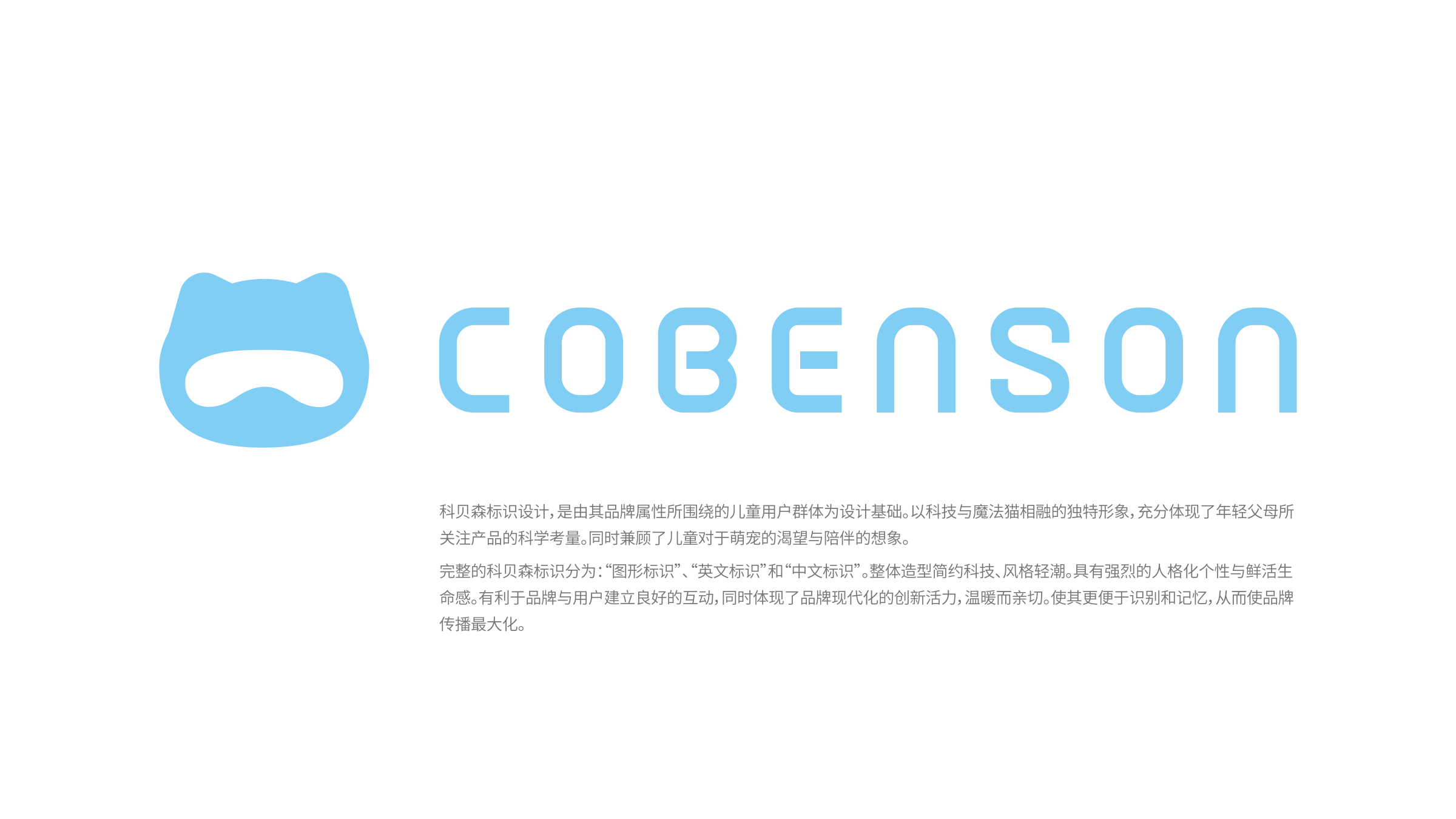 COBENSON科貝森標志設計,是由其品牌屬性所圍繞的兒童用戶群體為設計基礎。以科技與魔法貓相融的獨特形象,充分體現(xiàn)了年輕父母所關注產(chǎn)品的科學考量。同時兼顧了兒童對于萌寵的渴望與陪伴的想象。完整的COBENSON科貝森標識分為:“圖形標識”、“英文標識”和“中文標識”。整體造型簡約科技、風格輕潮。具有強烈的人格化個性與鮮活生命感。有利于品牌與用戶建立良好的互動,同時體現(xiàn)了品牌現(xiàn)代化的創(chuàng)新活力,溫暖而親切。使其更便于識別別和記憶,從而使品牌傳播最大化。